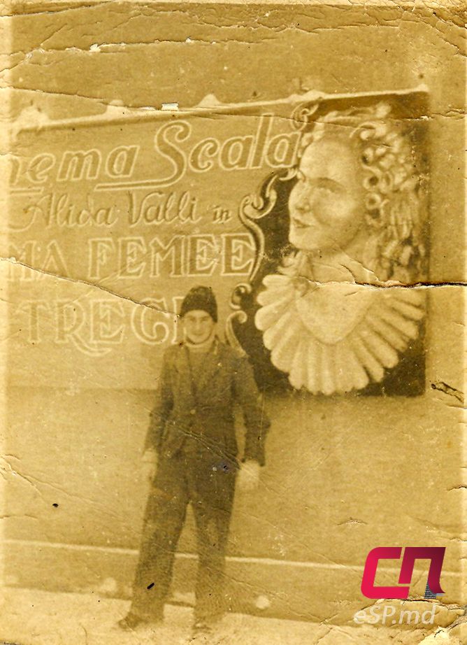 Обратите внимание на афишу, у которой стоит молодой человек. Информация, содержащаяся на ней, помогла нам уточнить дату создания фотографии. Плакат анонсирует фильм с итальянской актрисой Алидой Валли в главной роли. Понять, как называется картина, сложно. Однако, сопоставляя различные данные, мы выяснили, что речь идёт о ленте «La prima donna che passa». В румынском переводе это итальянское название звучало как «Prima femeie, care trece»; приблизительный перевод на русский — «Первая женщина, которая проходит». Фильм был снят в 1940 году, и можно предположить, что в бессарабских кинотеатрах он появился в том же году или в 1941-м. То есть снимок сделан между 1940 и 1943 годами (в 1944-м на территории Молдавии шли боевые действия).