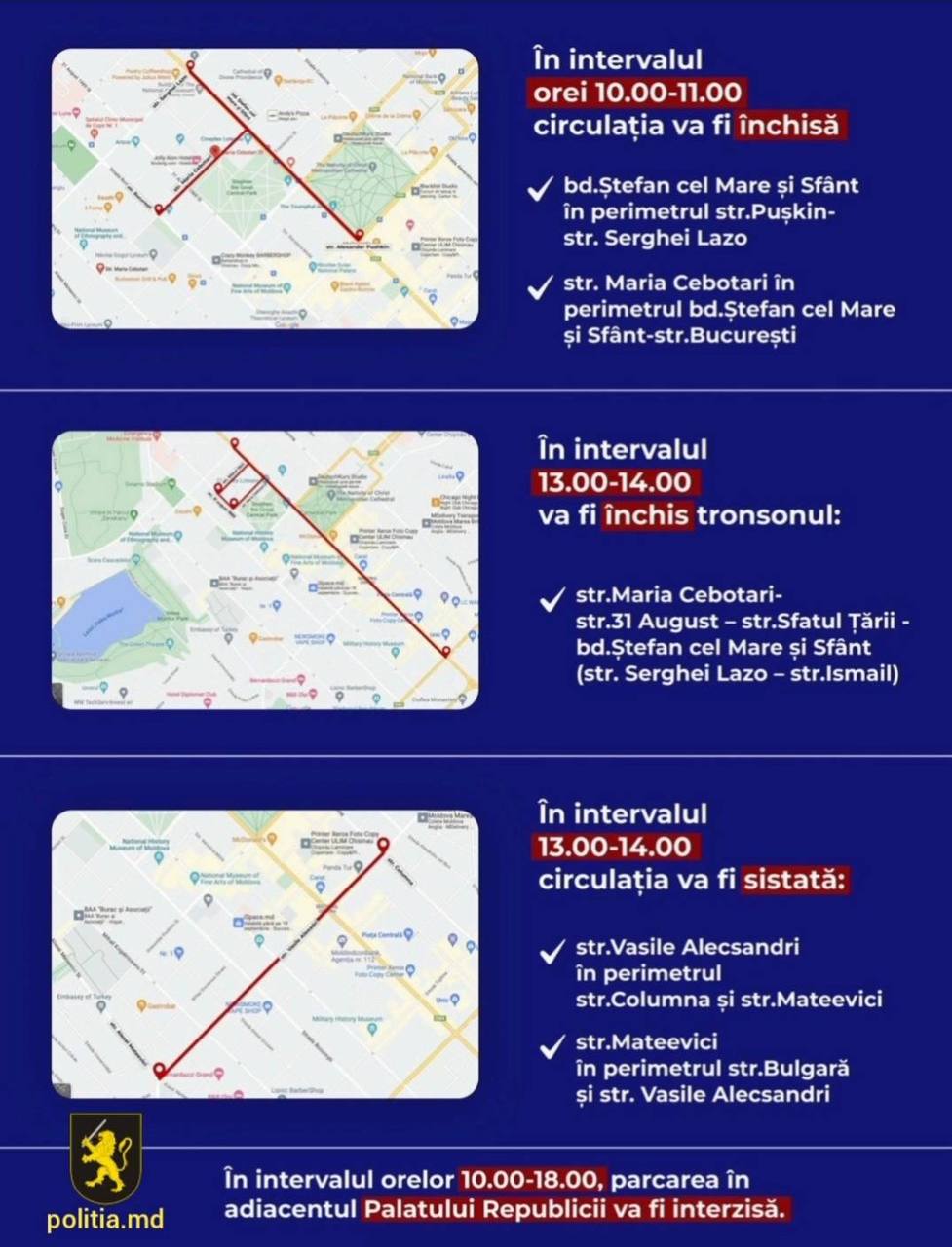 Între orele 10:00 — 18:00 parcarea în adiacentul Palatului Republicii va fi interzisă.
