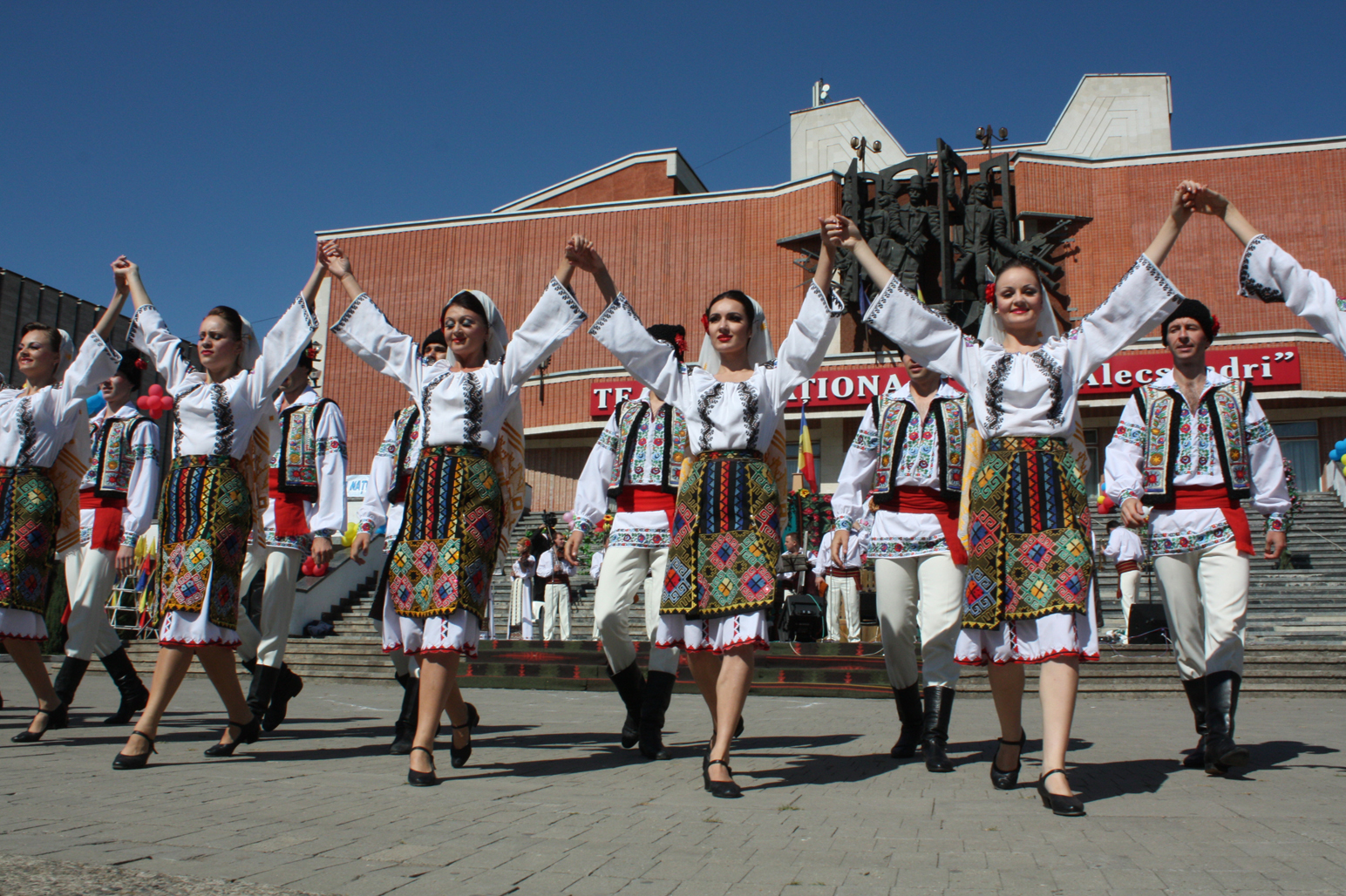 Концертная программа стартовала у Национального театра им. В. Александри. Гвоздём утренней пргораммы стало выступление Национального академического ансамбля народного танца «Жок».