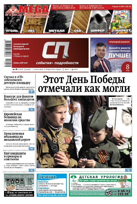 Анонсы его материалов. Этот День Победы отмечали как моглиФоторепортаж «СП» о том, как как в Бельцах отпраздновали 70-летие победы над фашизмом.Сигнал в «СП» «обезопасил» детскую площадкуПосле нашей публикации новое место для игр детей убрали от проезжей части.Конкурс для фанатов бельцких кандидатовГолосуйте в «СП» и покажите, у какой политической силы самые активные сторонники!Европейская больница на японские средстваВ Бельцах собираются строить региональную больницу. Приключения итальянца на молдавской дорогеГость из Италии пожаловался «СП» на незаконное задержание близ Бельц.Ещё кандидаты в примары и советникиСписок претендентов на пост бельцкого мэра ширится: Лилия Гуцул, Ренато Усатый, Вадим Вакарчук…Брюссель в поисках общего языкаМарина Бзовая в столице Европы разбиралась в проблемах восприятия евроинтеграции у нас.