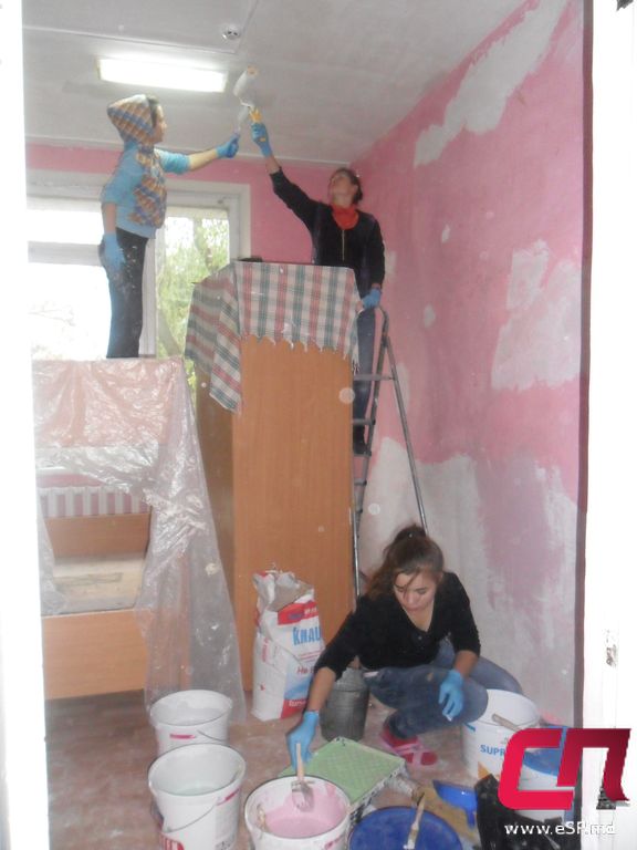 Мы обратились к администрации ПШ №1 с просьбой о помощи в ремонте комнат, в которых проживают дети нашего Центра, и сразу же к нам направили девушек–строителей. Это студентки третьего курса из группы № 1-13: Лаура Додица, Мария Кондор, Снежана Суружиу и из группы №1-15 Диана Драченко, Кристина Герман и Дойна Чиботинка. Девушки отлично справились с работой под руководством мастеров высшей категории и большим трудовым стажем Элеоноры Маковски и Елены Дудник.