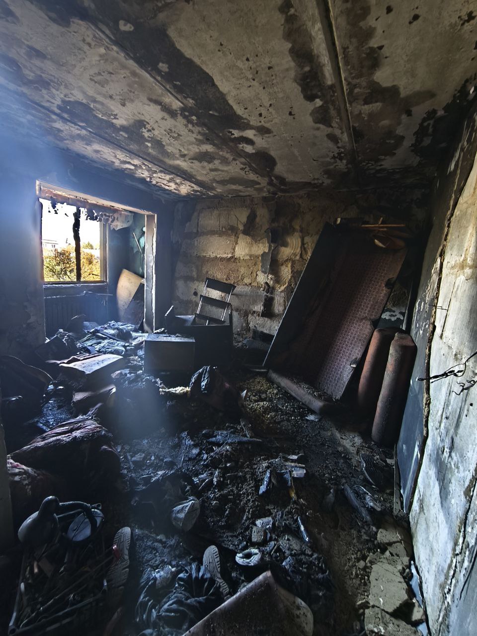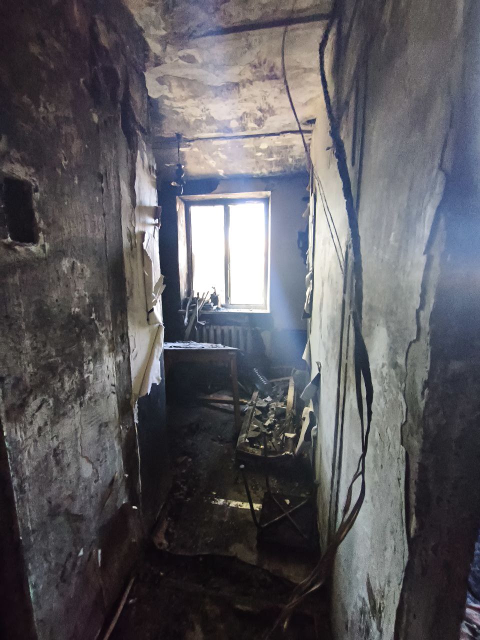 В результате осмотра установлено, что пожар произошёл внутри квартиры площадью около 25,7 м², состоящей из прихожей, кухни и одной жилой комнаты. Горение происходило в жилой комнате размером примерно 3×4 м, сгорело имущество. Остальные помещения квартиры пламенем не затронуты, но были задымлены.