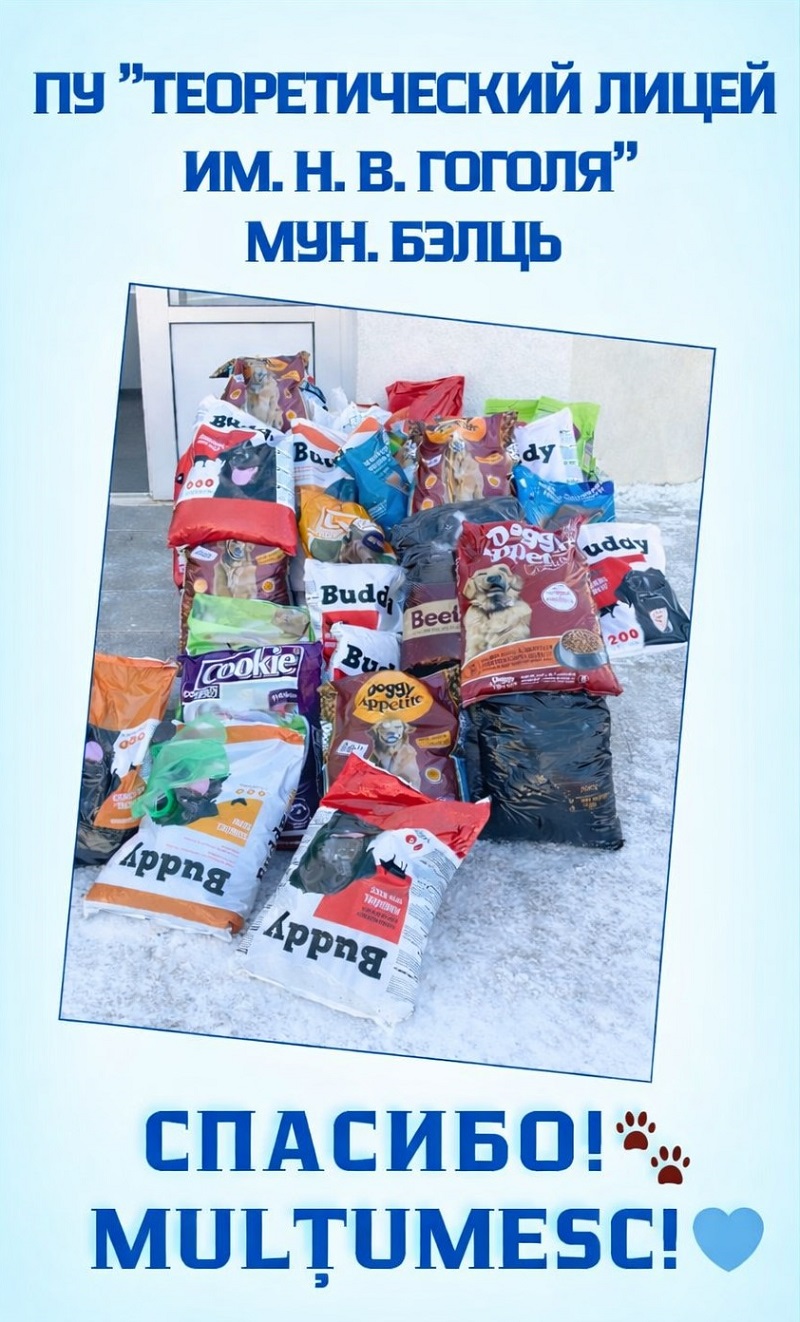 Центр приюта для бездомных животных в Бельцах поблагодарил педагогов, родителей и учащихся Теоретического лицея им. Н. В. Гоголя, а также инициаторов благотворительной акции за помощь его подопечным. В рамках акции для собак и щенков, которые пока не нашли своих хозяев и находятся в центре, собрали сотни килограммов корма.