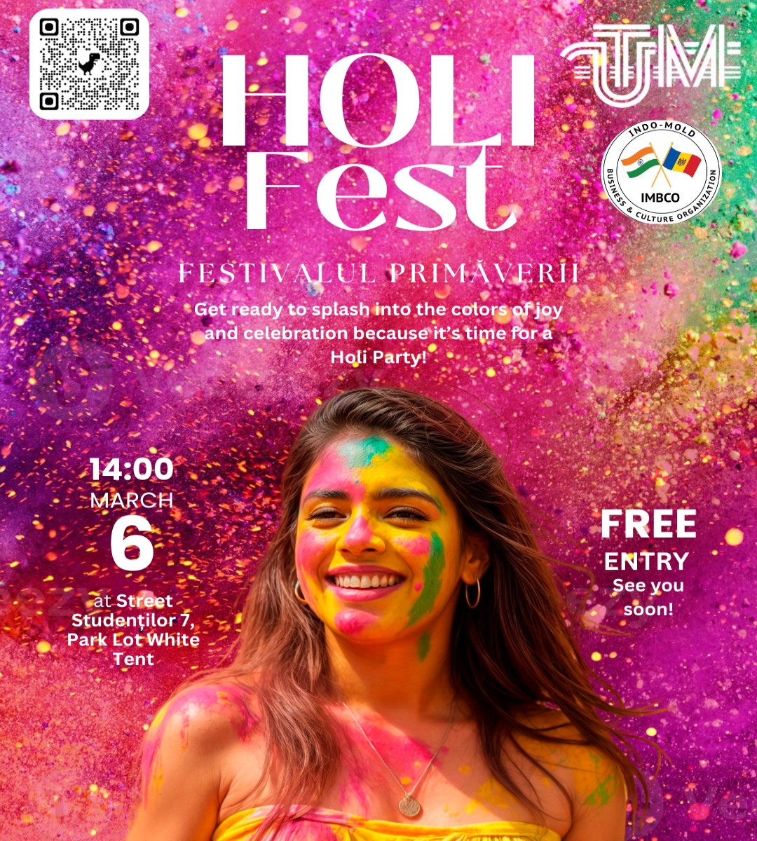 Технический университет Молдовы (UTM) приглашает всех желающих на фестиваль красок Холи. Мероприятие пройдет 6 марта в шатре на парковке по адресу: улица Студенцилор, 7, начало в 14:00.