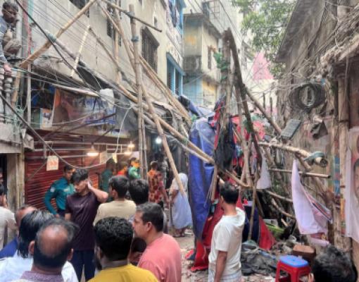 Жители стоят в переулке после эвакуации из своего дома рядом с обрушившимися строительными лесами. Фото: Reuters